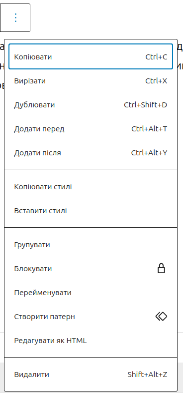 Нарешті останній пункт – три крапки по вертикалі має ті ж можливості, що і в блоці абзацу – копіювати, вставити, видалити.