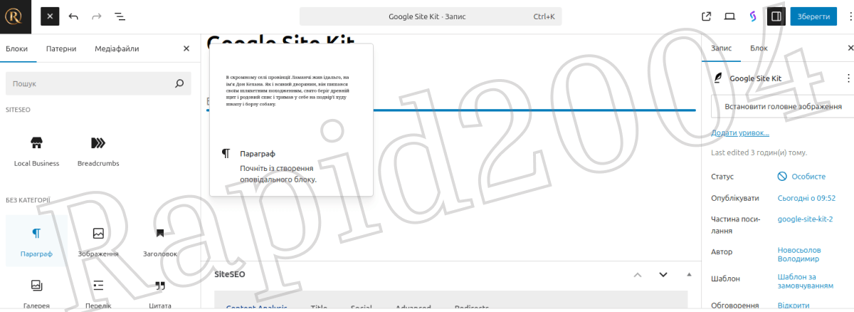 В принципі, я запис починаю з цієї підготовки, тому пройдуся по вже заповнених полях. Потім трохи по SEO (у мене преміум-версія і плагін не Yoast) і, швидше за все, на цьому буде крапка.