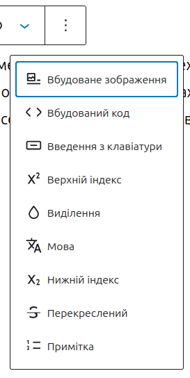 Стрілка вниз відкриває меню додаткових можливостей тексту (ліва картинка нижче). Вибране слово можна написати верхнім (або нижнім) індексом, додати до нього виноску, вставити в текст зображення або вбудований текст та інші (всього 10 варіантів).